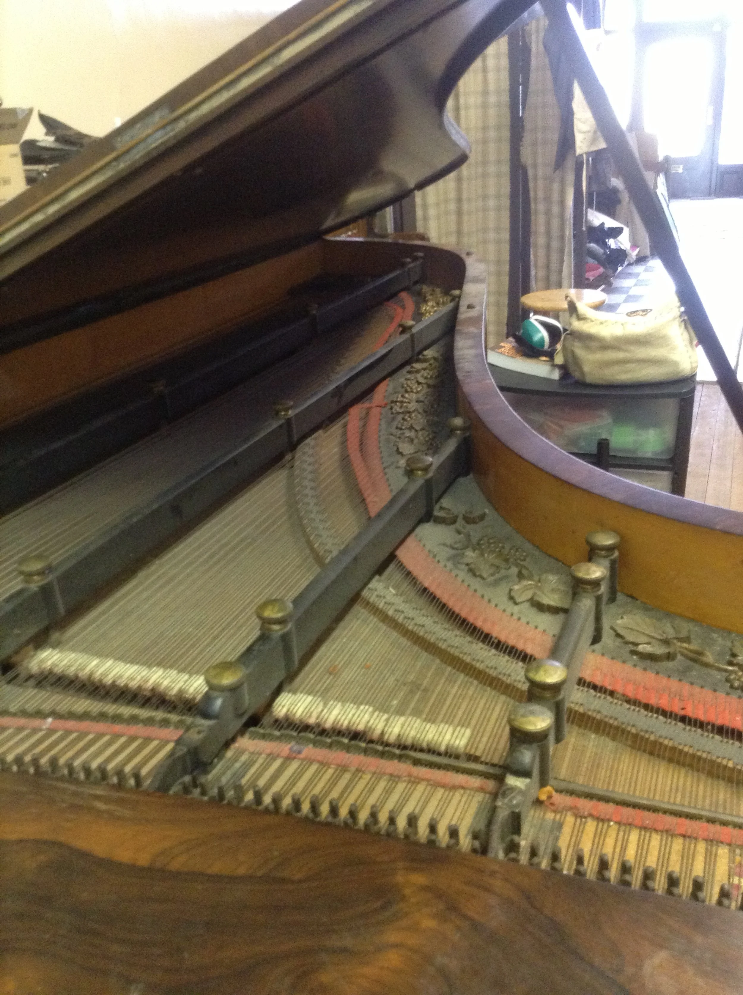 Lemeuel Gilbert Upright Made in Boston 1850’s. Case in rosewood, over-dampers, bi-chord throughout, straight-strung, leather hammers, and true una-corda. No cast plate, only metal truss rods running through the back posts. Very delicate, angelic, and pure sound Under restoration.